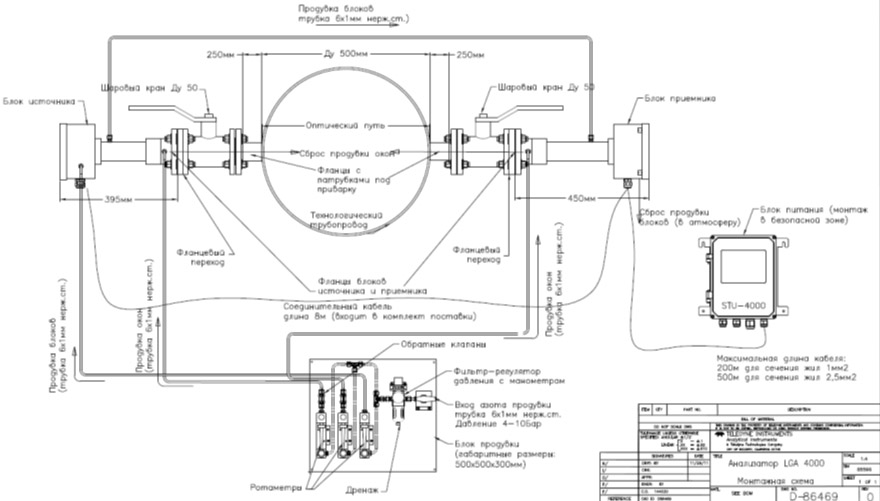 Одним из наиболее перспективных методов газового анализа является метод полупроводниковой лазерной спектроскопии (ПЛАС), который в последнее время получает все более широкое распространение. Современные лазерные анализаторы еще далеки для идеала, но для ряда применений они являются единственно возможным решением. К таким применениям относятся анализ кислорода в колоннах с глубоким вакуумом, анализ следовой влажности в агрессивных газах, анализ аммиака. Измерение данных веществ стало возможным в следствии того, что лазерные анализаторы могут монтироваться непосредственно на технологические трубопроводы без систем подготовки пробы. Лазерные анализаторы за счет модуляции спектра минимизируют влияние фоновых газов. Однако стоит очень осторожно подходить к выбору данных анализаторов и учитывать особенности монтажа, а также температуру и давление в процессах. Данные анализаторы состоят из блока источника, блока приемника и блока продувки, предназначенного для обеспечения взрывозащиты и продувки оптики для защиты от загрязнений. На приведенной ниже схеме показан типовой вариант монтажа анализатора LGA-4000 в процесс.