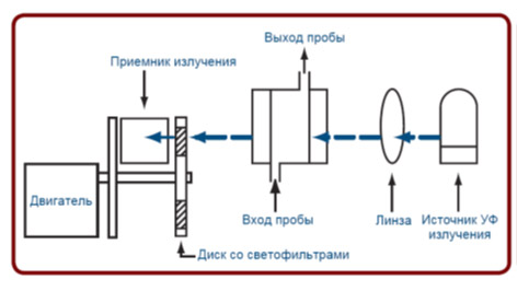 Анализаторы Teledyne серии 6000 предназначены для измерения веществ, имеющих ультрафиолетовый и видимый спектр поглощения. Измерительная ячейка состоит из широкопо лостного источника излучения, колеса со светофильтрами и приемника излучения. Излучение от источника направляется через со ответствующий светофильтр в измерительную кювету. После прохождения луча через полосовой фильтр в излучении остаются только те длины волн, которые поглощаются измеряемым веществом и не поглощаются другими компонентами пробы. Такой пучок света проходит через пробу газа и поглощается исследуемым компонентом пропорционально его концентрации. Далее оставшееся излучение попадает через колесо со светофильтрами на приемник излучения, при помощи которого оценивается его интенсивность и определяется концентрация исследуемого компонента. Наличие сигнала сравнения позволяет компенсировать влияние загрязнений, дрейфа источника излучения и других факторов.